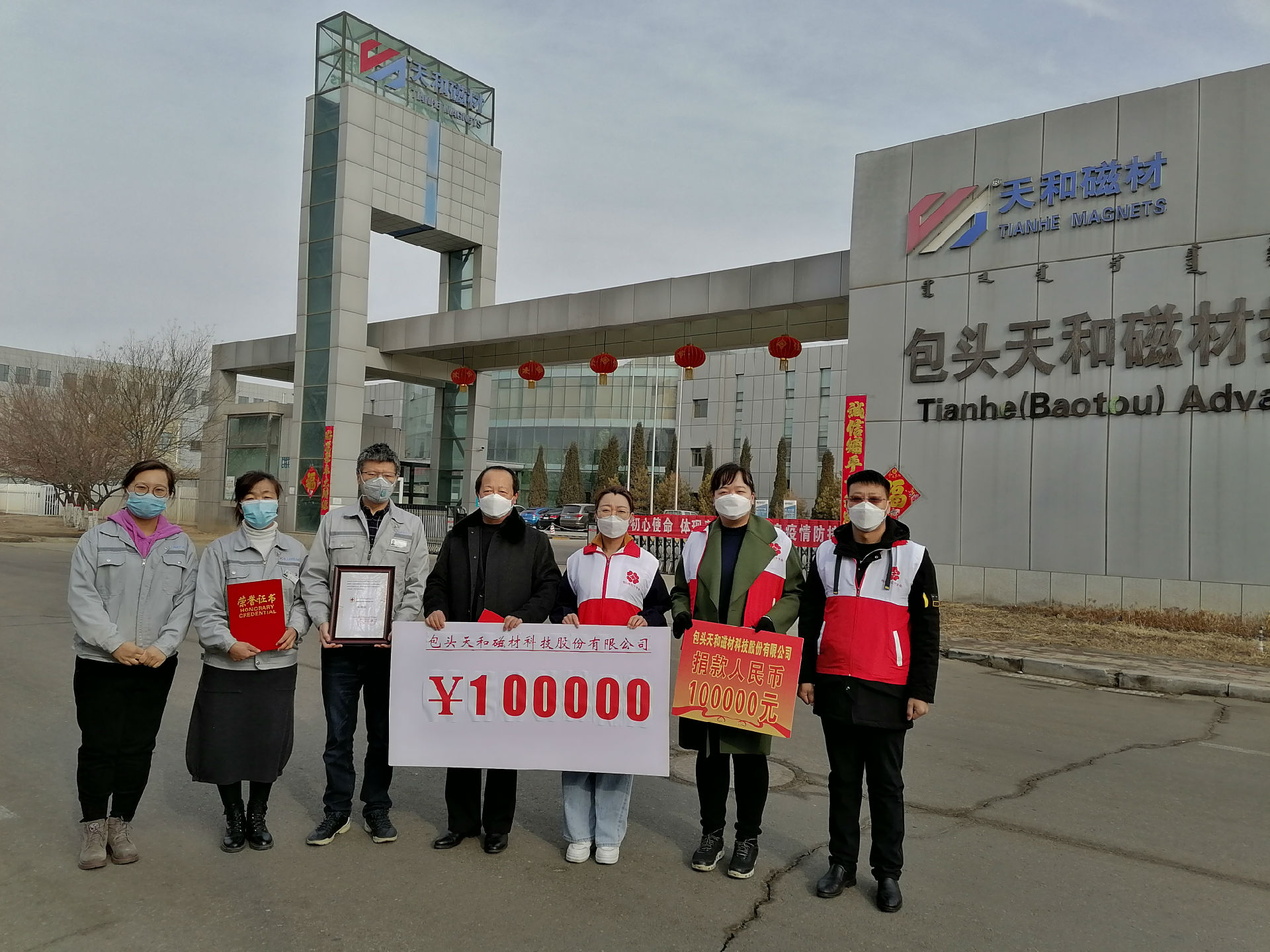 2月27日,天和磁材向包头稀土高新技术产业开发区红十字会捐赠人民币10万元,用于支援疫情防控。